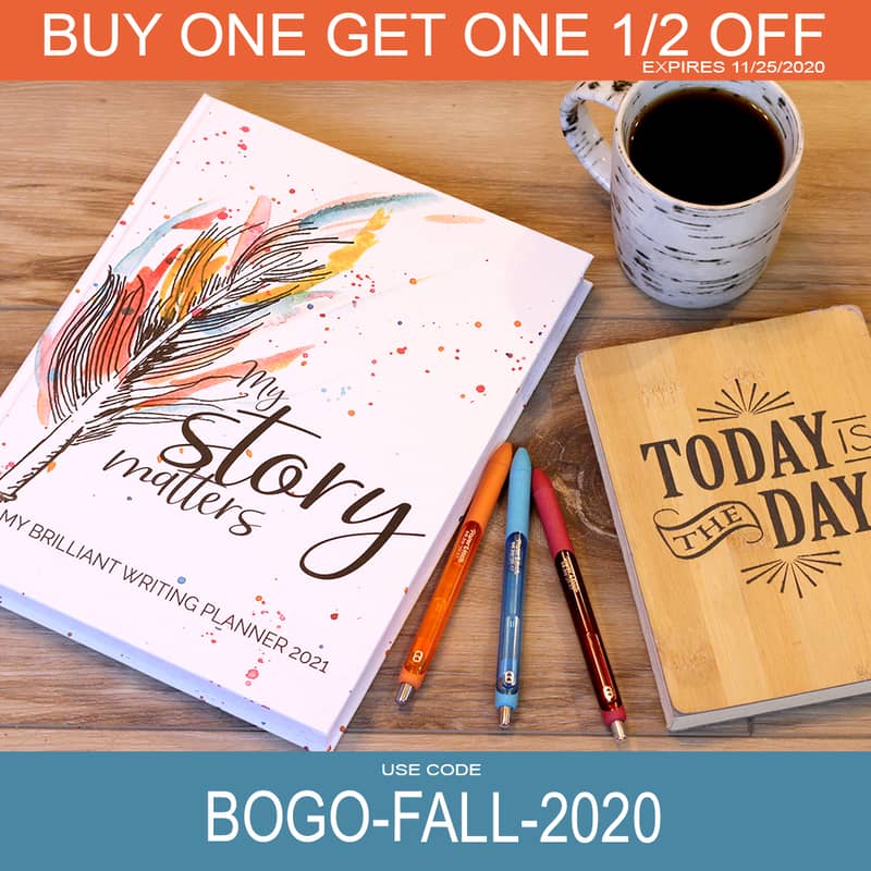 P.S The 2021 Your Story Matters: My Brilliant Writing Planner is out and RIGHT NOW we have a Buy One, Get One ½ off special. These make fantastic Christmas gifts for the creatives in your life! And, we have 4 brilliant sizes. Check them out here. And use code: BOGO-FALL-2020 to get your ½ off!